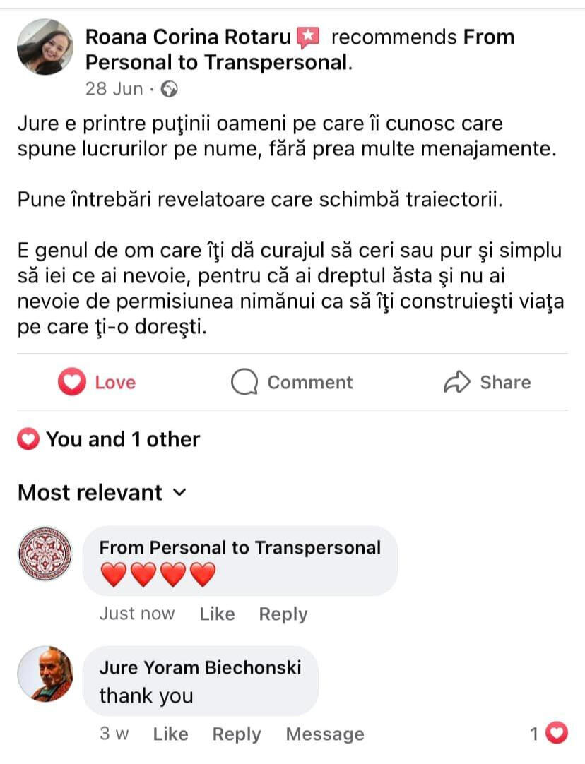 Utilizăm datele pe care le colectăm pentru:Furnizarea și administrarea serviciilor, inclusiv pentru a afișa conținut personalizat și pentru a facilita comunicarea cu alți utilizatori;Facilitarea funcționării tehnice a serviciilor, inclusiv rezolvarea și soluționarea problemelor, asigurarea serviciilor și prevenirea fraudei și abuzurilor;Procesarea înscrierilor și a comenzilor pentru cursuri, produse, servicii etc. dar şi comunicarea cu dvs. pentru a vă răspunde la întrebări şi solicitări.Trimiterea mesajelor și informațiilor administrative, inclusiv mesaje de la traineri și facilitatori, notificări despre modificările aduse serviciilor noastre și actualizări ale acordurilor noastre;Trimiterea informațiilor și a mesajelor cu privire la progresele înregistrate în cursuri, beneficii, servicii noi, funcții noi, promoții, mesaje informative și alte cursuri disponibile (mesaje de la care vă puteţi dezabona în orice moment);Solicitarea de feedback şi înţelegerea nevoilor dvs. cu ajutorul furnizorilor de servicii de analiză;Identificarea utilizatorilor unici;Îmbunătățirea serviciilor noastre și dezvoltarea de noi produse, servicii și funcții;Analiza tendințelor și a traficului pe site-uri sau promovarea serviciilor noastre pe site-uri și aplicații;POLITICA PRIVIND PROTECȚIA DATELOR CU CARACTER PERSONALLegea Uniunii Europene referitoare la protecția datelor cu caracter personal, “General Data Protection Regulation” (denumit în continuare “GDPR”) a intrat în vigoare pe 25 Mai 2016, dar începe să-și producă efectele de la 25 Mai 2018.Protecția datelor dumneavoastră cu caracter personal este importantă pentru noi, prin urmare, acordăm o atenție deosebită protejării vieții private a vizitatorilor care accesează unul dintre site-urile noastre, în conformitate cu Regulamentul (UE) 2016/679 al Parlamentului European și al Consiliului din data de 27 aprilie 2016 privind protecția persoanelor fizice în ceea ce privește prelucrarea datelor cu caracter personal și libera circulație a acestor date (denumit în continuare “GDPR”).Vă rugăm să acordați o atenție deosebită lecturării următoarei Politici (denumită în continuare “DPP”, pentru a înțelege modul în care vor fi tratate informațiile dumneavoastră („date personale”).DPP explică practicile From Personal to Transpersonal , referitoare la aplicarea prevederilor GDPR, precum și drepturile de care beneficiați cu privire la modul în care informațiile dumneavoastră sunt utilizate prin intermediul aplicaţiilor From Personal to TranspersonalPrelucrarea datelor cu caracter personal efectuată de From Personal to Transpersonal se va realiza întotdeauna în conformitate cu prevederile GDPR, precum și cu reglementările privind protecția datelor cu caracter personal, specifice fiecărei țări în care SANATATE INTEGRALA-CORP MINTE SUFLET S.R.L. operează.Prin DPP, From Personal to Transpersonal dorește să informeze vizitatorii cu privire la natura datelor cu caracter personal pe care le colectăm și le procesăm, precum și cu privire la scopurile prelucrării. În plus, vizitatorii site-urilor sunt informați prin intermediul DPP și cu privire la drepturile de care beneficiază.CINE SUNTEM?Brandul From Personal to Transpersonal reprezentat prinSANATATE INTEGRALA-CORP MINTE SUFLET S.R.L., CUI: 51101018, J2025000467000.Colectarea acestor date se face doar cu acordul dumneavoastră.CE SUNT DATELE CU CARACTER PERSONAL?„Date personale” înseamnă orice informație sau informații care vă pot identifica direct (de exemplu numele dumneavoastră) sau indirect (de exemplu, prin intermediul datelor pseudonime, cum ar fi un număr de identificare unic).Aceasta înseamnă că datele personale includ lucruri precum adresa, numele și prenumele, sexul, data și locul nașterii, datele din actele de stare civilă, telefon/fax, adresă (domiciliu/reședință), e-mail, profesie, loc de muncă, formare profesionala, situație familială, situație economico-financiară, date privind bunurile deținute, obișnuinte/preferințe/comportament, imagine, voce, preferințele personale și obiceiurile de cumpărături, conținutul generat de utilizatori, informațiile financiare și informațiile privind situația financiară.Acesta ar putea include și identificatori numerici unici, cum ar fi adresa IP a computerului dumneavoastră sau adresa MAC a dispozitivului dumneavoastră mobil, precum și modulele cookie.CE ÎNSEAMNĂ PRELUCRAREA DATELOR CU CARACTER PERSONAL?“Prelucrarea” înseamnă orice operațiune sau set de operațiuni efectuate asupra datelor cu caracter personal sau asupra seturilor de date cu caracter personal, cu sau fără utilizarea de mijloace automatizate, cum ar fi colectarea, înregistrarea, organizarea, structurarea, stocarea, adaptarea sau modificarea, extragerea, consultarea, utilizarea, transmiterea prin transmitere, diseminarea sau punerea la dispoziție în orice alt mod, alinierea sau combinarea, restricționarea, ștergerea sau distrugerea.TEMEIUL ȘI SCOPURILE PRELUCRĂRII DATELOR CU CARACTER PERSONALÎn scopul încheierii și executării contractelor – Conform art. 6 alin. 1 lit. b) din GDPR, pot fi prelucrate date personale în scopul încheierii sau executării contractului. Pentru a putea să vă oferim produsele și serviciile noastre, este nevoie să prelucrăm date cu caracter personal care vă aparț